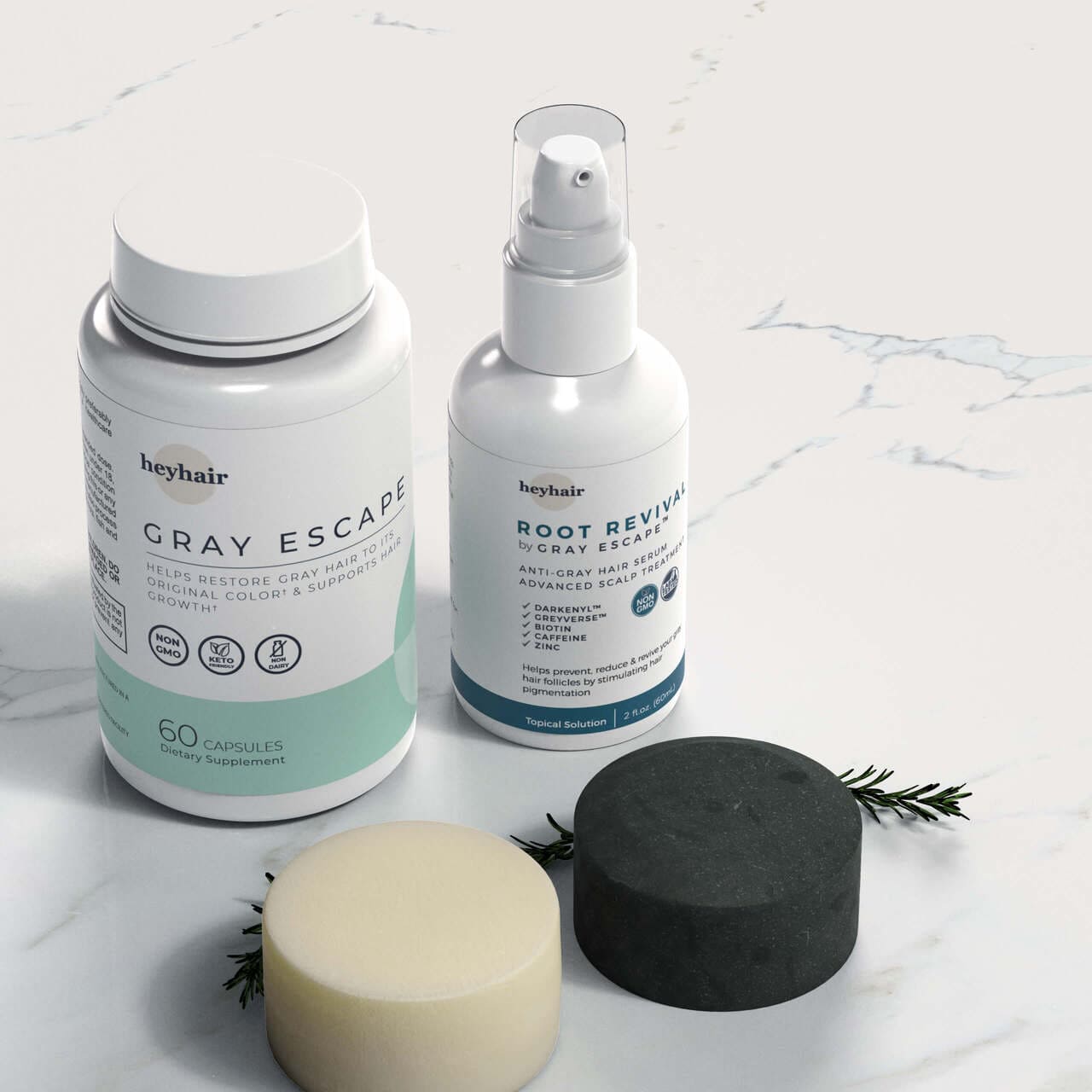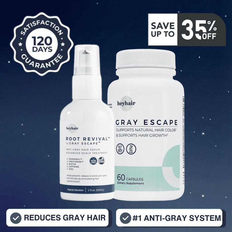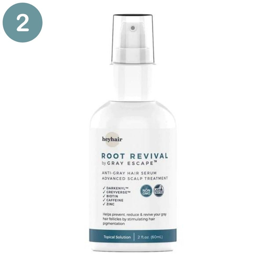 Root Revival™ Anti-Gray Hair Serum was formulated to be used in tandem with Gray Escape™ Hair Supplements for best results. Together they are the recommended ideal routine for the person with moderate levels of gray hair (approximately 30% or fewer grays), using the serum to decrease the appearance of grays on new hair growth, while taking the supplements to delay new gray hair growth. It’s easier to preserve your natural hair color than reverse gray hair.