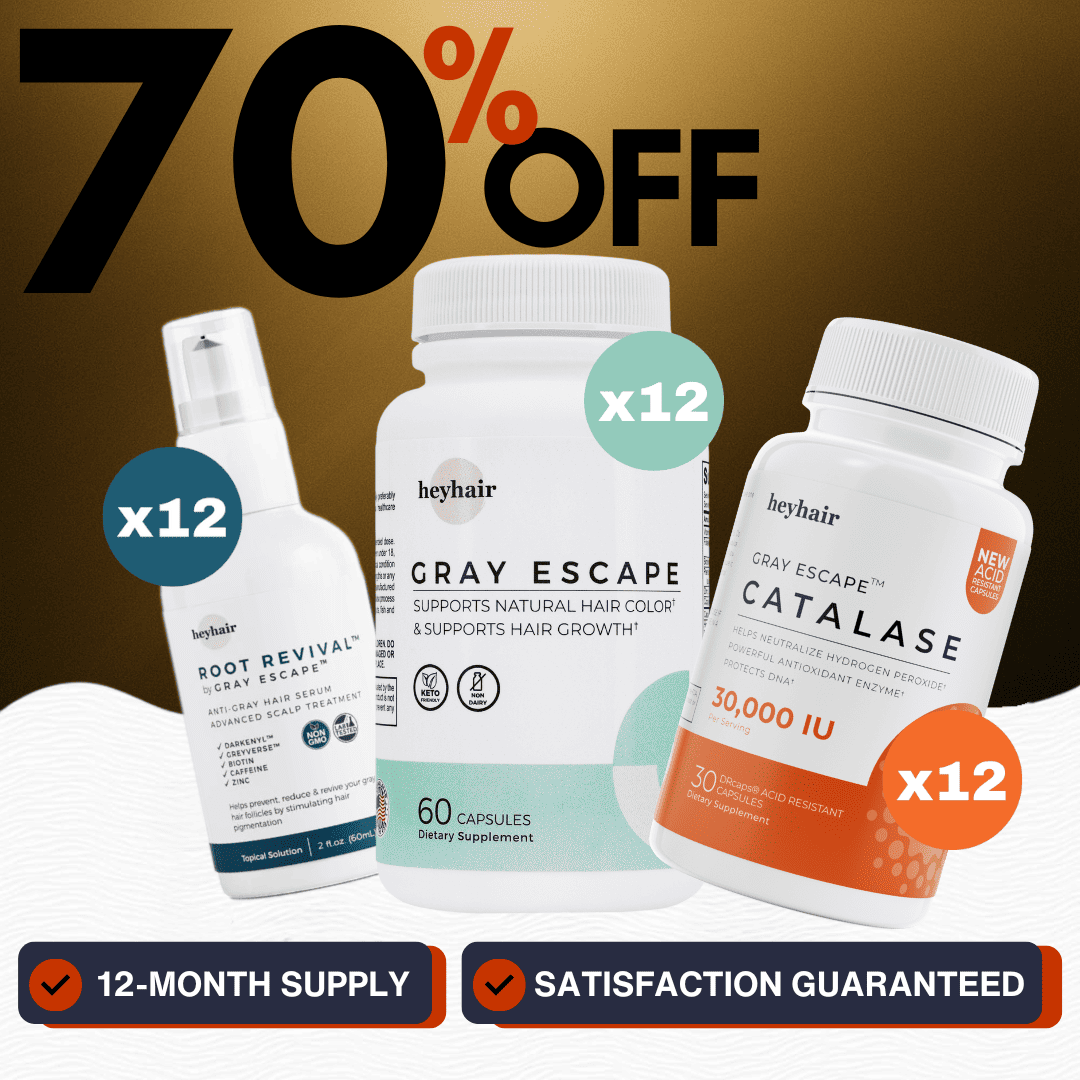 Our Anti-Gray Hair Vitamin provides the first kick in our treatment and gives your body the nutrients it will need to fight gray hair, making up for any vitamin deficiencies you may have and providing the perfect environment for proper natural hair pigmentation.