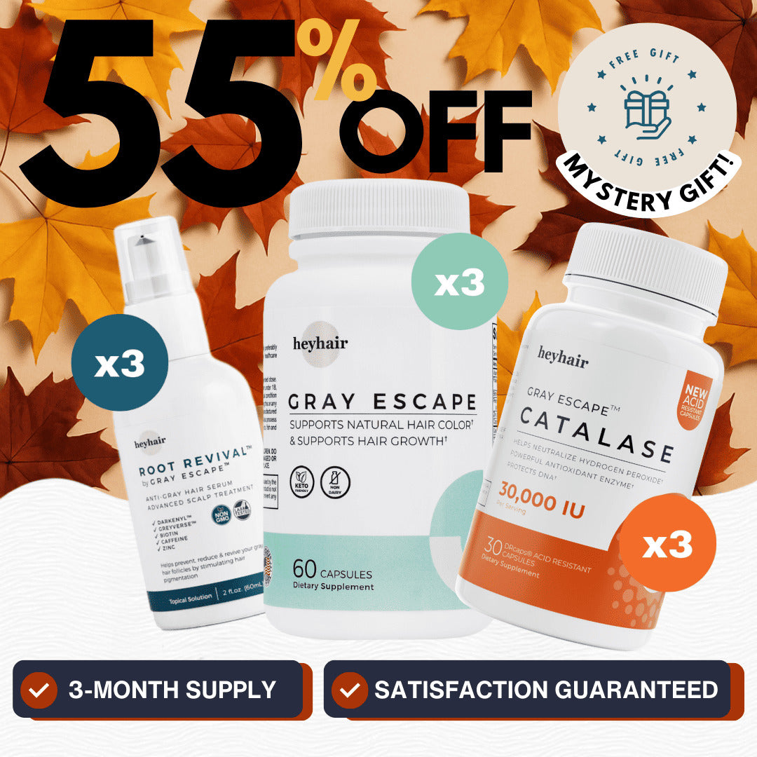 • Triple-Action Gray Hair Defense – Combine the power of Catalase CORE 30,000, Gray Escape™, and Root Revival™ to effectively target graying hair, support repigmentation, and promote vibrant, youthful hair.